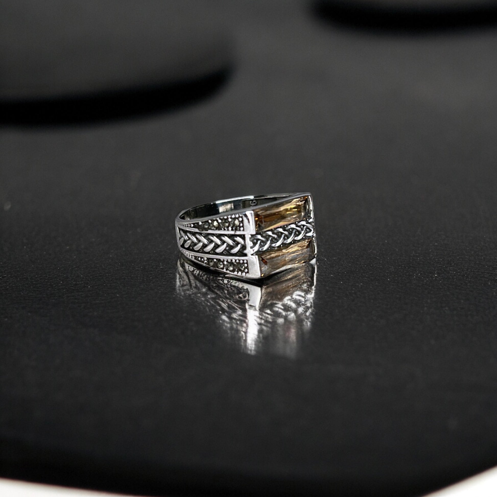 Enhance your style with our men's 925 sterling silver ring, featuring intricate braided detailing on top of amber zircon. This unique design combines the strength of sterling silver with the natural warmth of amber, offering a bold yet sophisticated look. Perfect for the modern man who values craftsmanship, this ring blends rugged elements with refined elegance; making it a timeless addition to any collection.