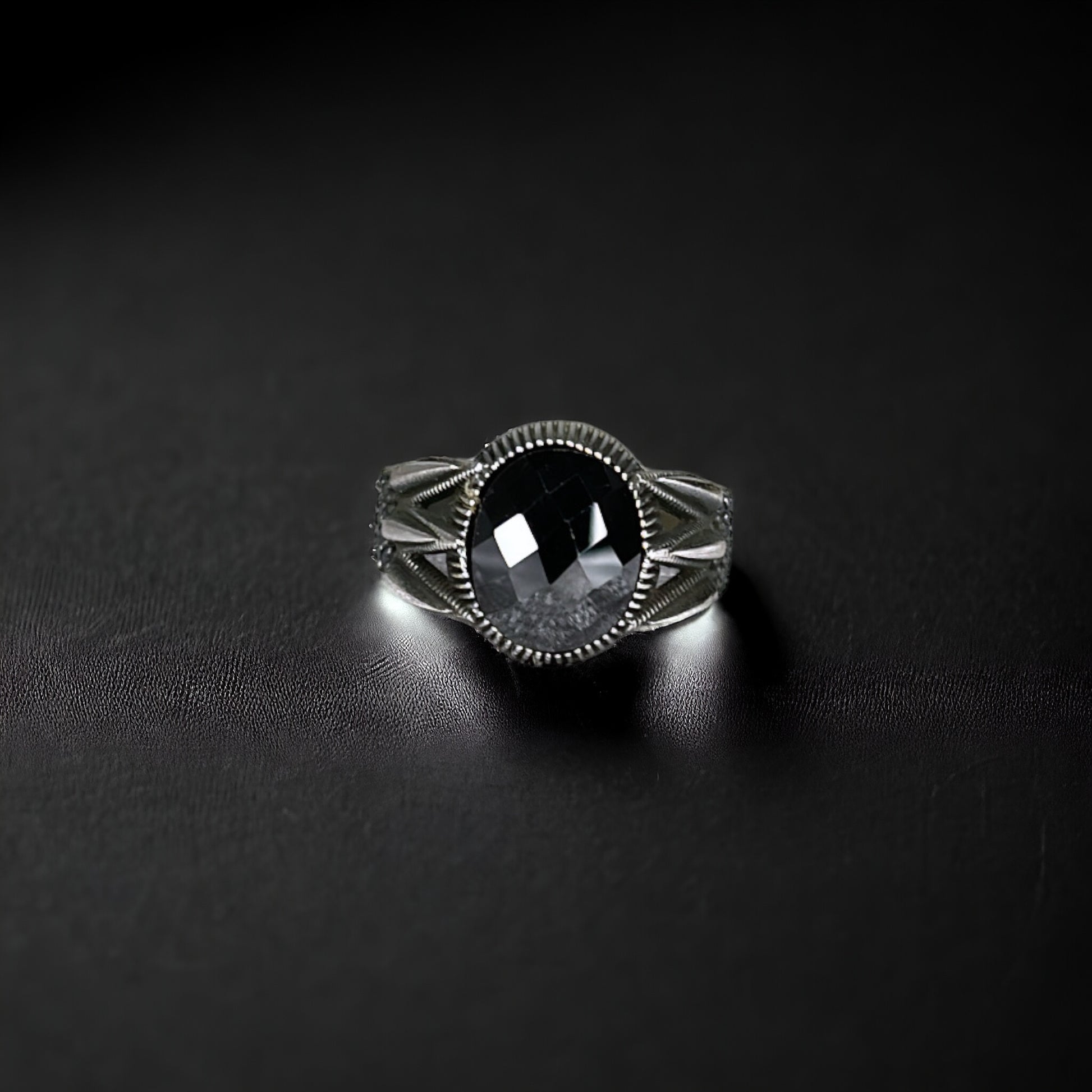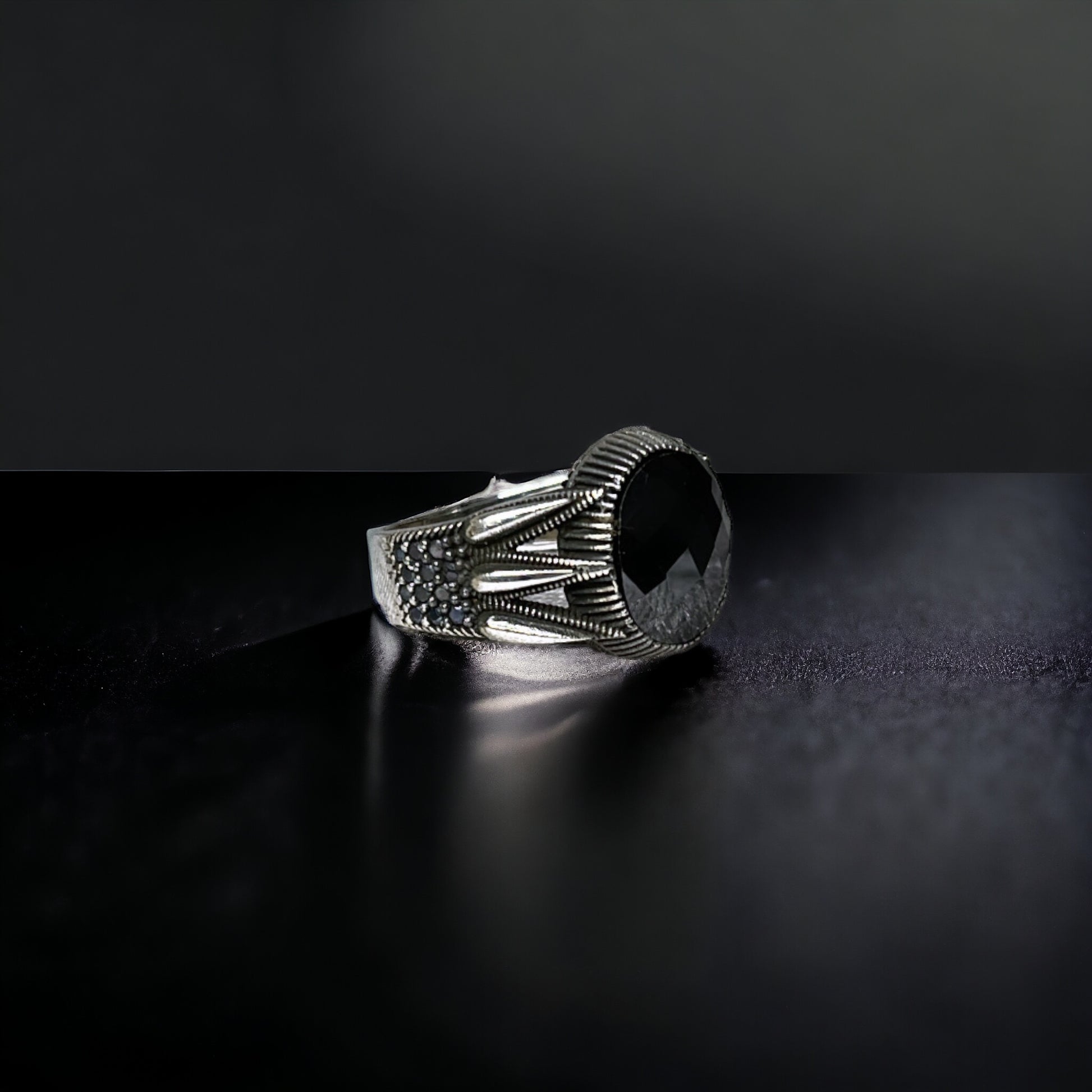 Step into the world of refined elegance with this handcrafted ring, featuring a striking black zircon stone at its centre. Known for its deep, compelling colour, the black zircon provides a stark contrast to the meticulously designed 925 Sterling Silver band, which is embellished with cubic zircon stones. These additional stones add a subtle sparkle, enhancing the overall sophistication of the piece. This ring is perfect for men who appreciate a blend of modern style with traditional craftsmanship.