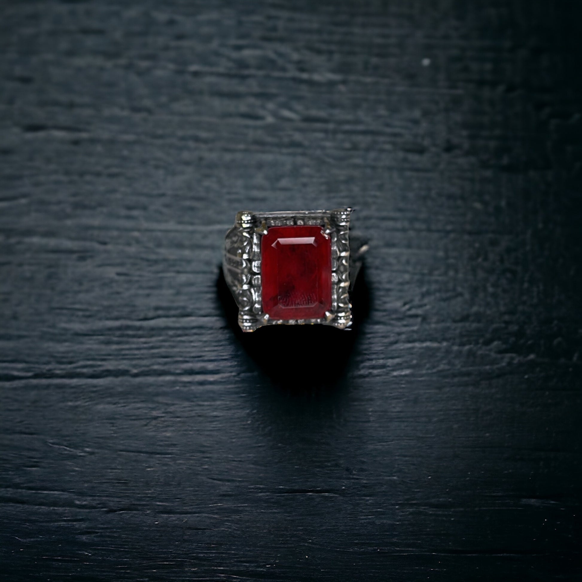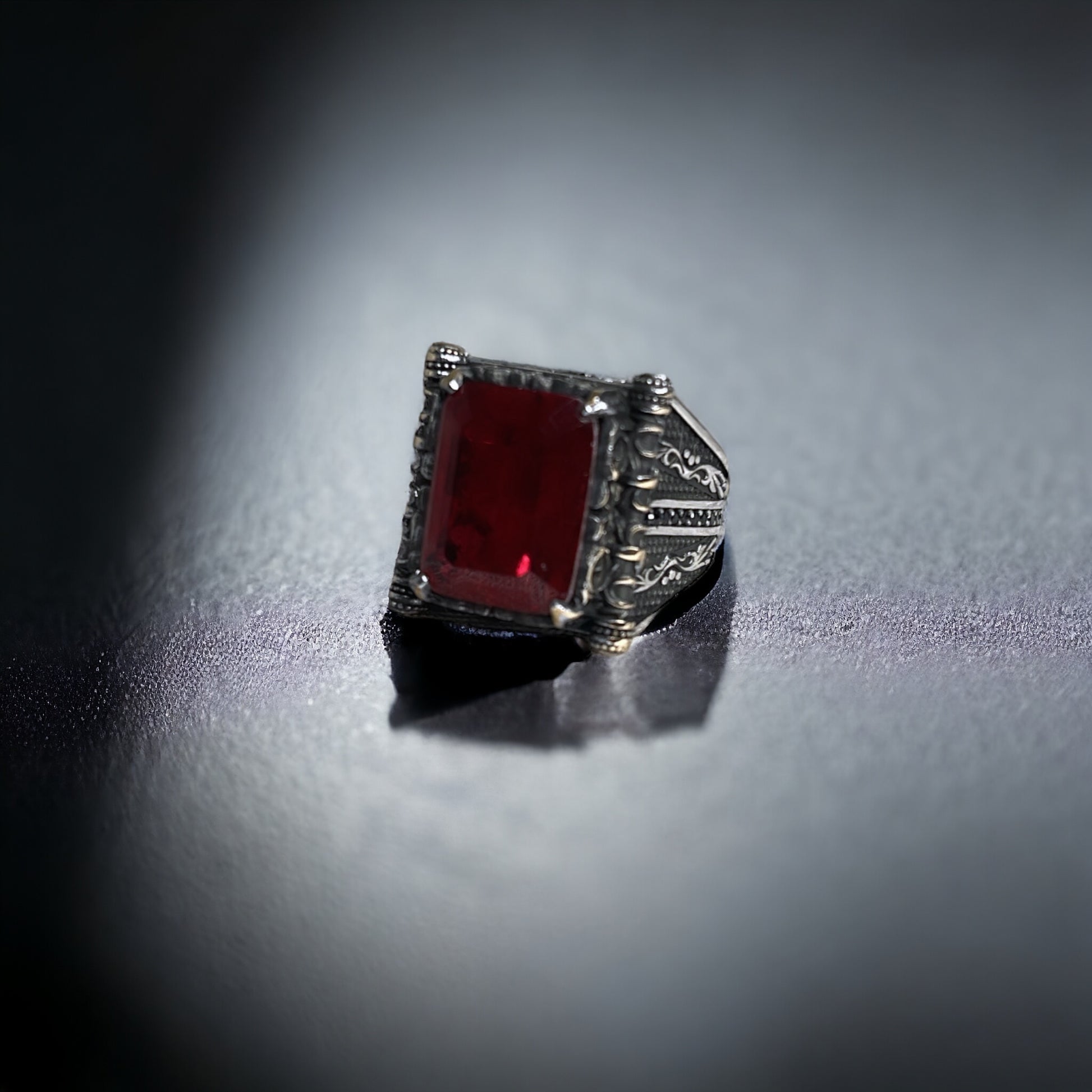 Step into the world of refined elegance with this handcrafted ring, featuring a striking ruby zircon stone at its centre. Known for its vibrant and rich red hue, the ruby zircon provides a stunning contrast to the meticulously designed 925 Sterling Silver band, which is adorned with intricate engravings. The detailed craftsmanship of the silver band enhances the ring's regal presence, making it an exceptional piece for those who appreciate a perfect blend of bold colour and traditional artistry.