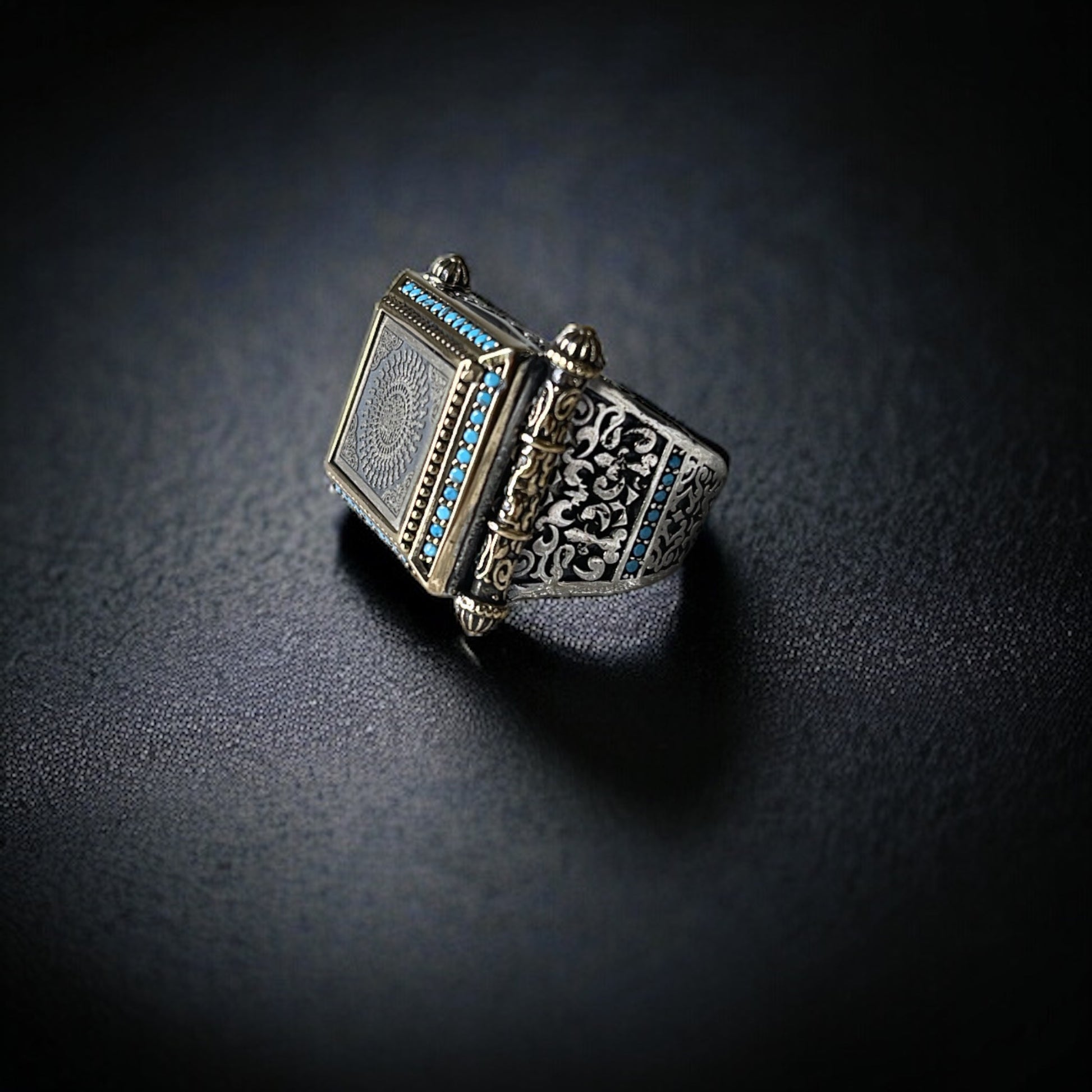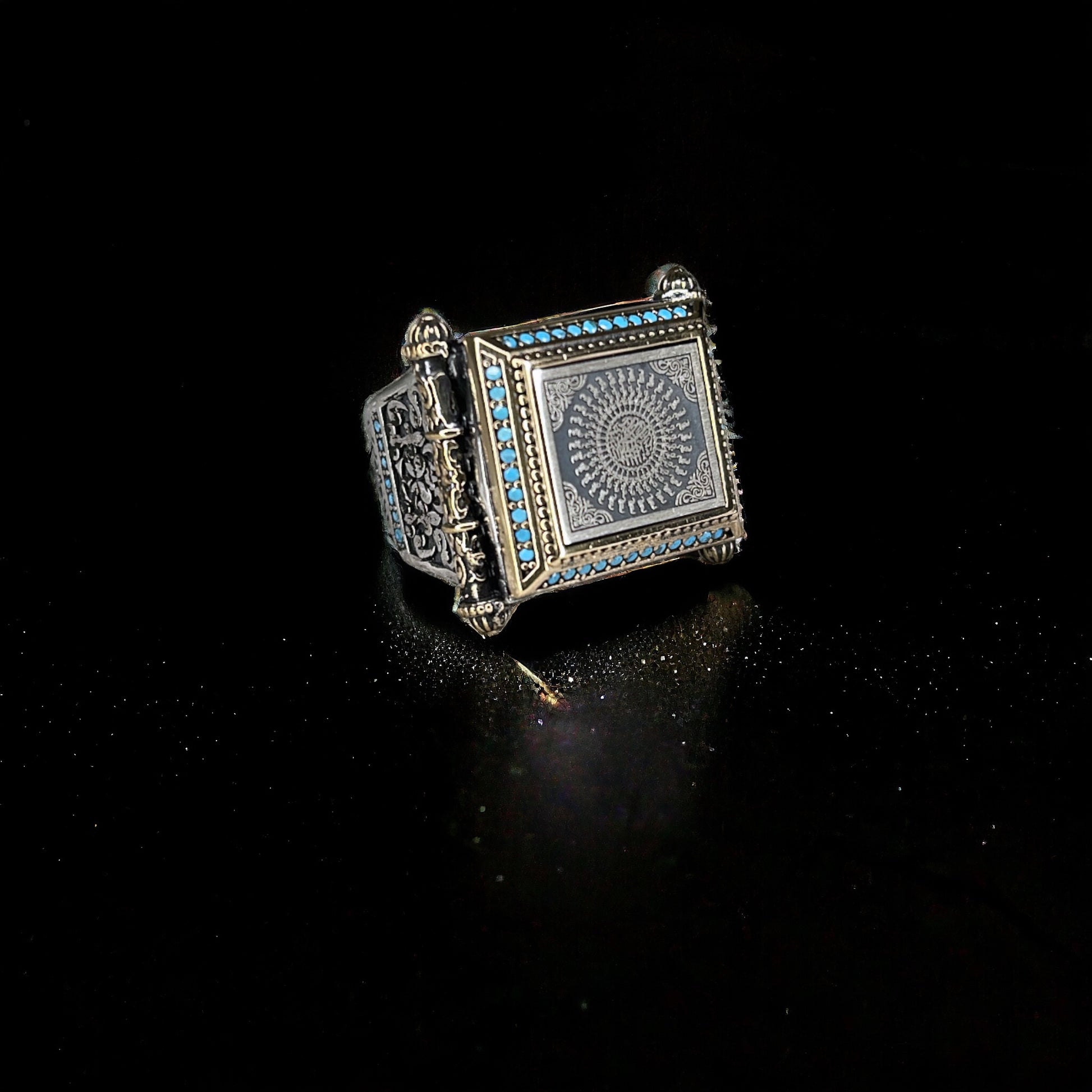 Step into the world of refined elegance with this ring, featuring intricate Islamic calligraphy of Allah’s name as its centrepiece. The sacred inscription is beautifully framed by a meticulously crafted 925 Sterling Silver band, adorned with cubic turquoise stones that add a vibrant contrast to the design. This ring seamlessly blends spiritual significance with exquisite craftsmanship.