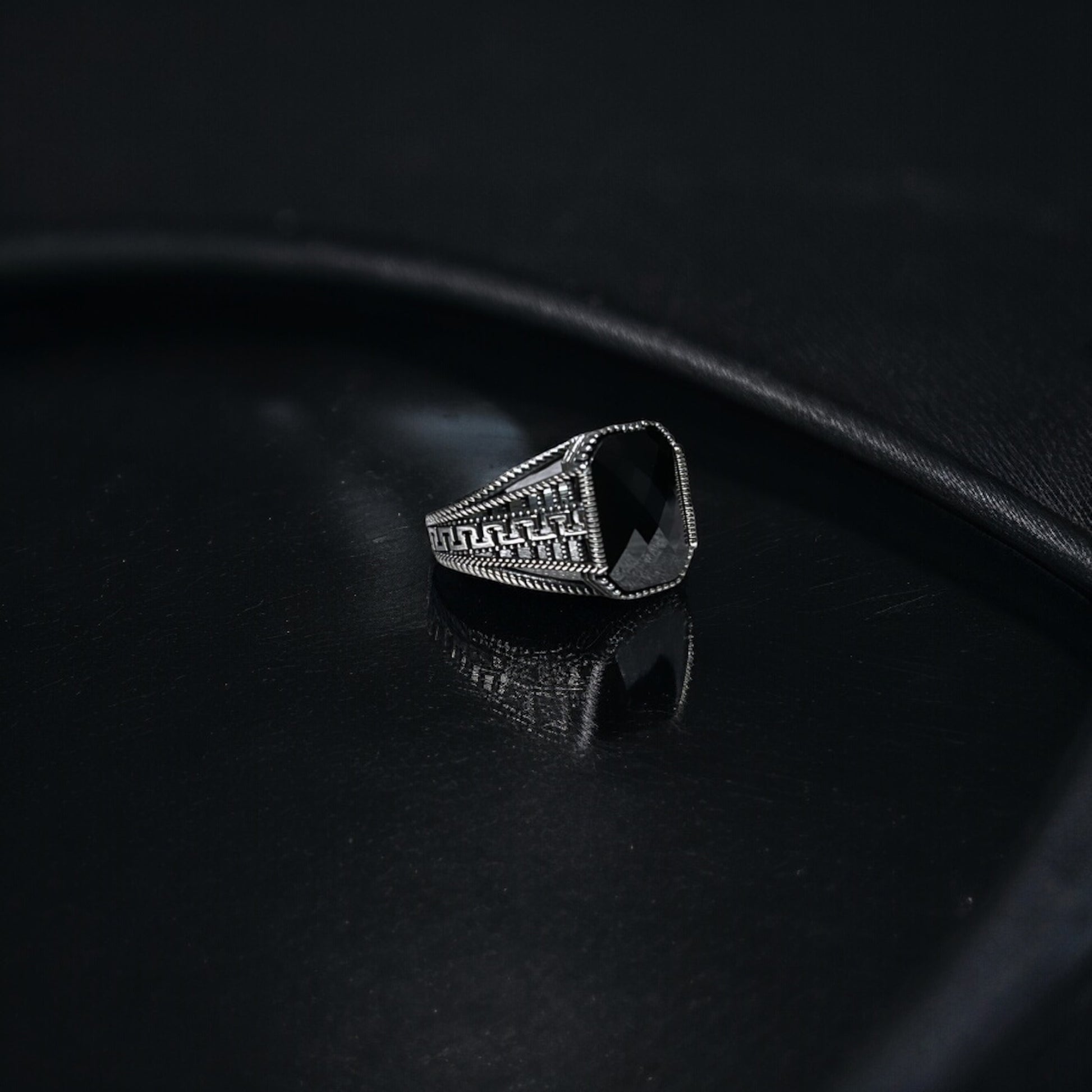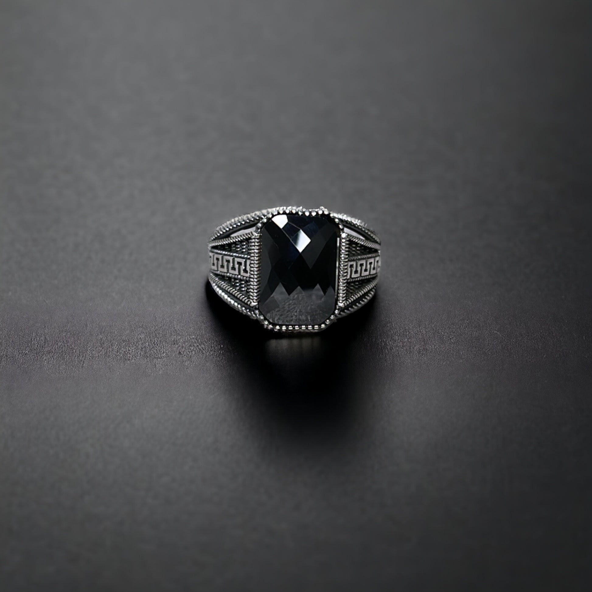 This stunning ring showcases an onyx zircon stone, renowned for its deep, captivating black colour that exudes sophistication and strength. The stone is expertly set in a 925 Sterling Silver band, which is detailed with intricate patterns that add a touch of elegance to the overall design. This ring is perfect for those who appreciate the unique allure of onyx zircon, a stone that embodies mystery and power.