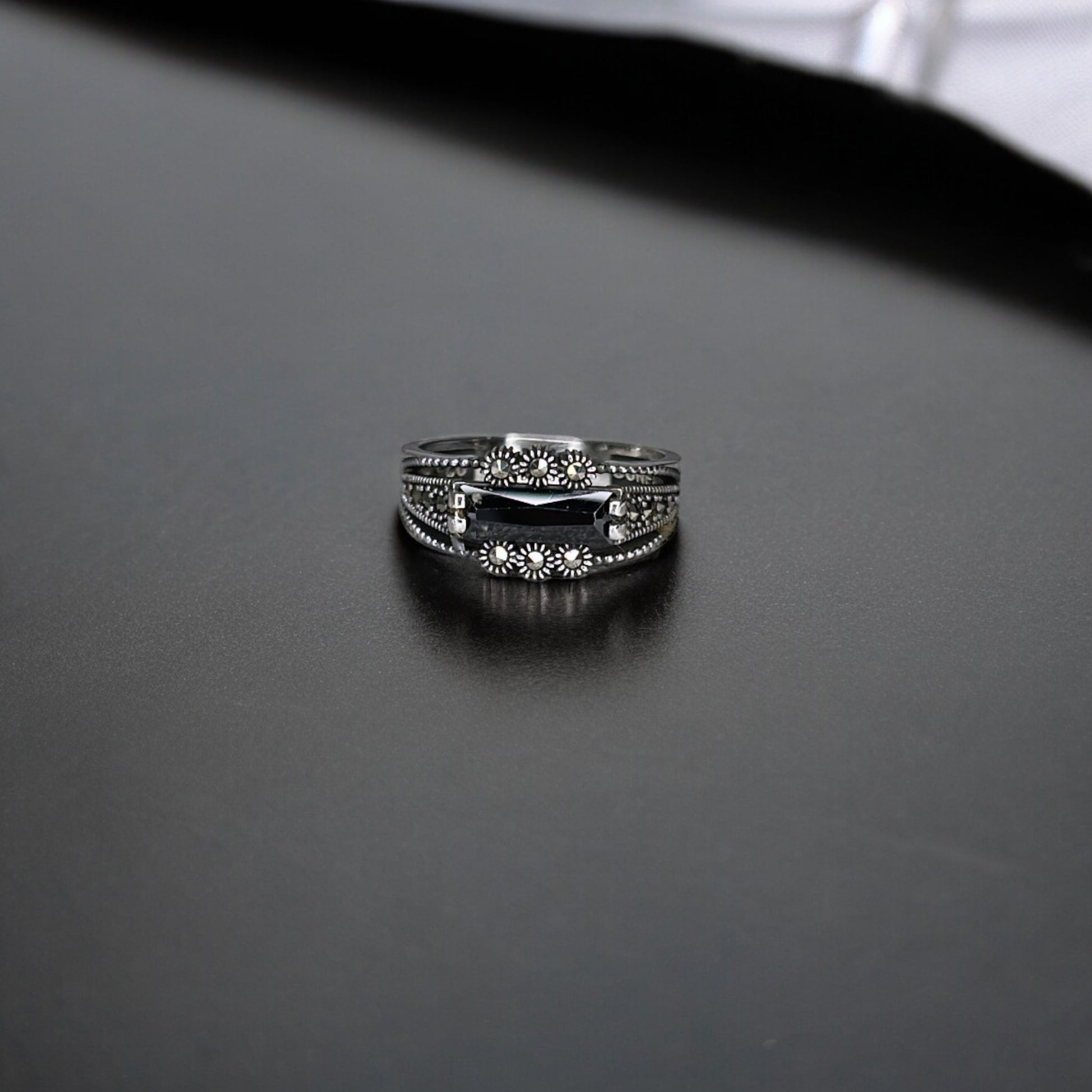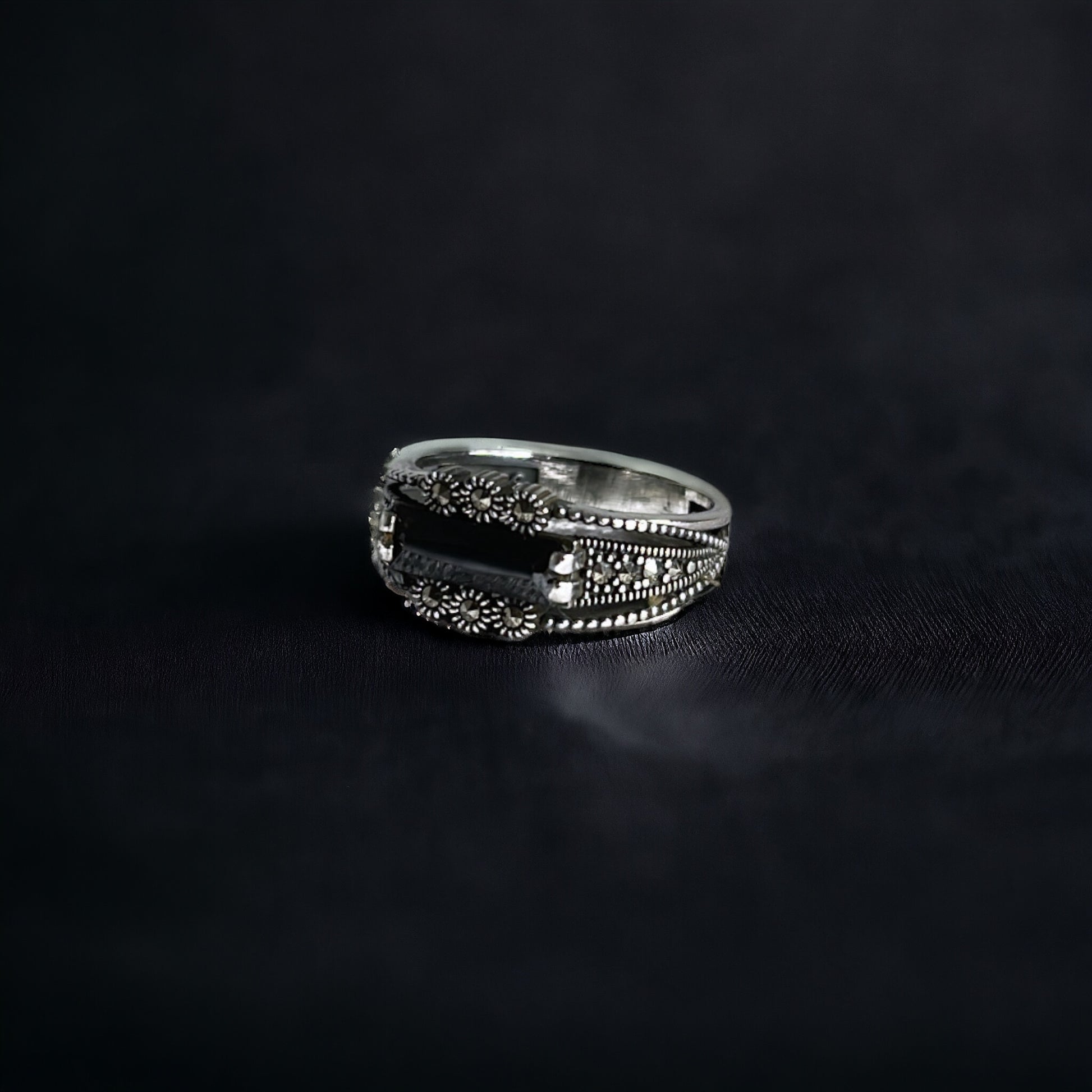 This exquisite ring features an onyx zircon stone, celebrated for its deep, mysterious black hue that conveys both elegance and strength. The stone is set within a 925 Sterling Silver band adorned with intricate beadwork patterns, enhancing its overall charm and uniqueness. The combination of the dark onyx zircon and the detailed silver work makes this ring an exceptional piece for any collection.
