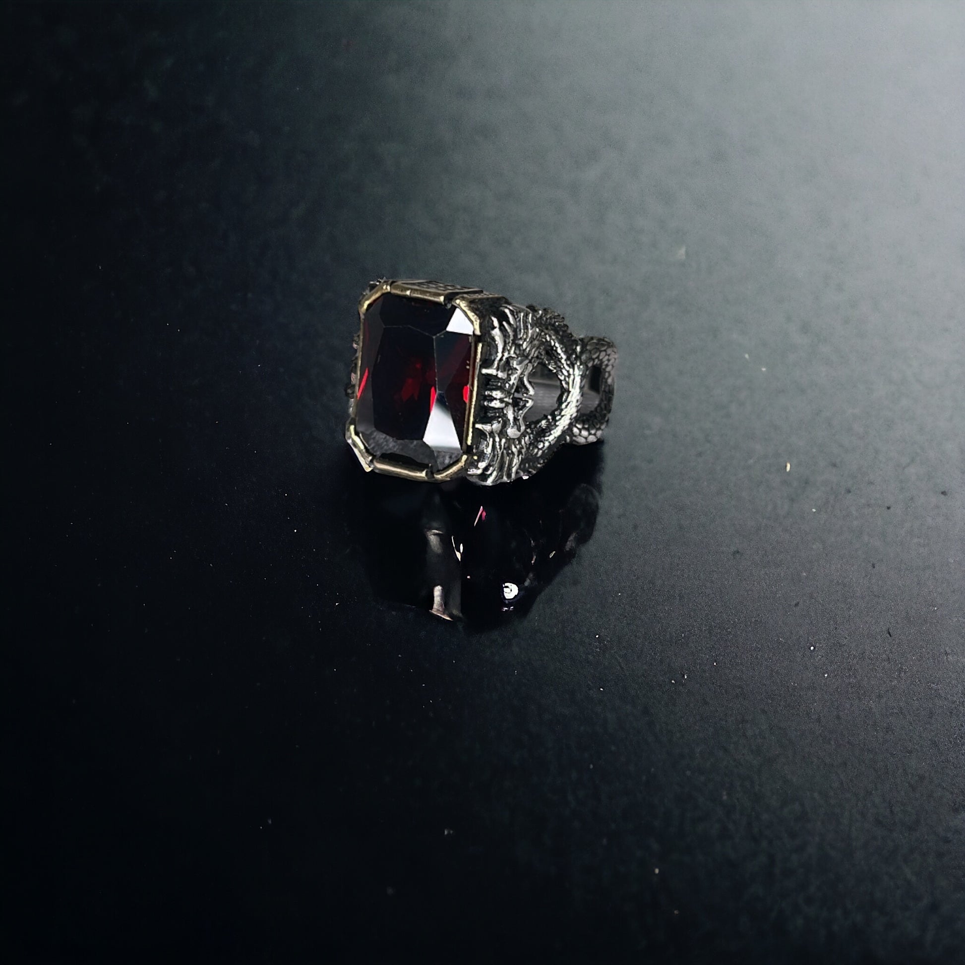This striking ring features a mesmerizing Ruby Zircon stone, known for its deep red hue and brilliant sparkle, making it a captivating centerpiece. The stone is elegantly set within a 925 Sterling Silver band, adorned with intricate dragon-inspired details, adding a touch of mystique and power to this remarkable piece. Ruby Zircon is celebrated for its brilliance and durability, offering a timeless elegance.