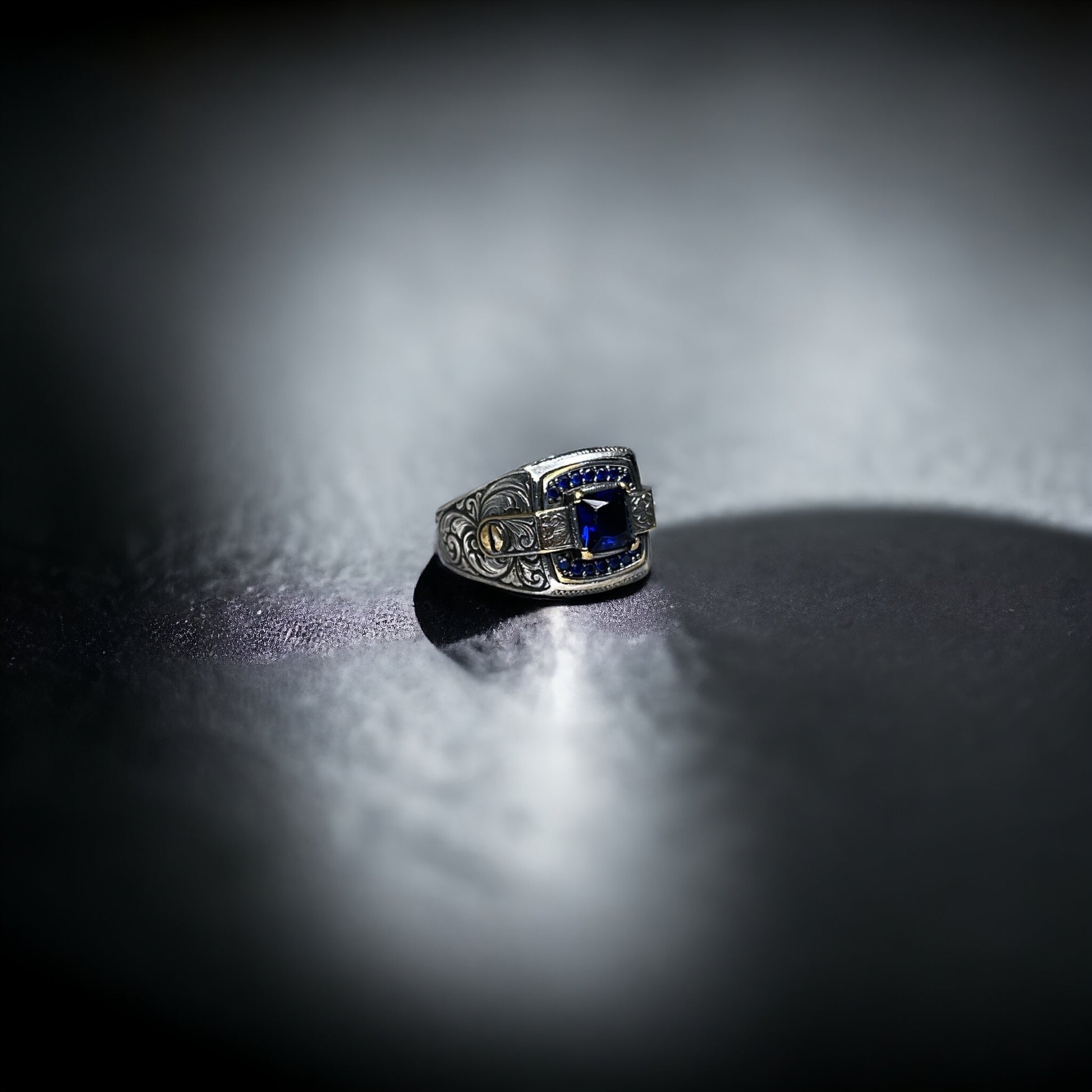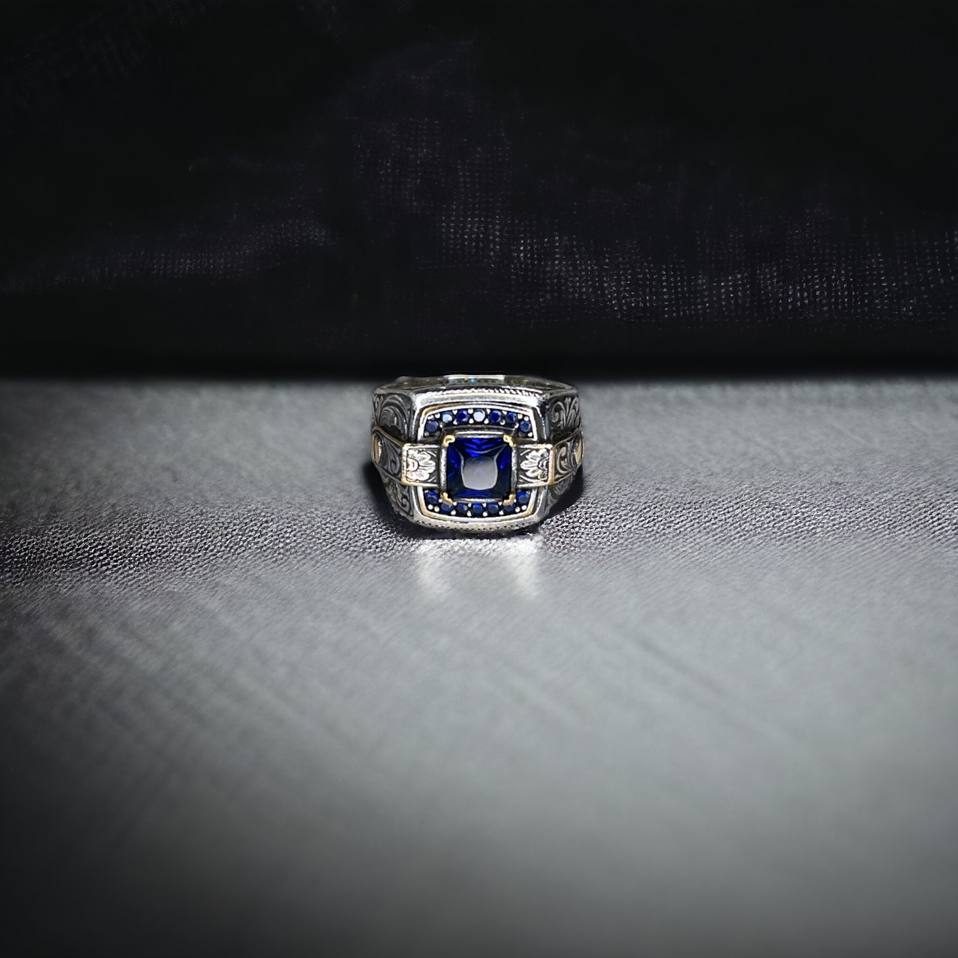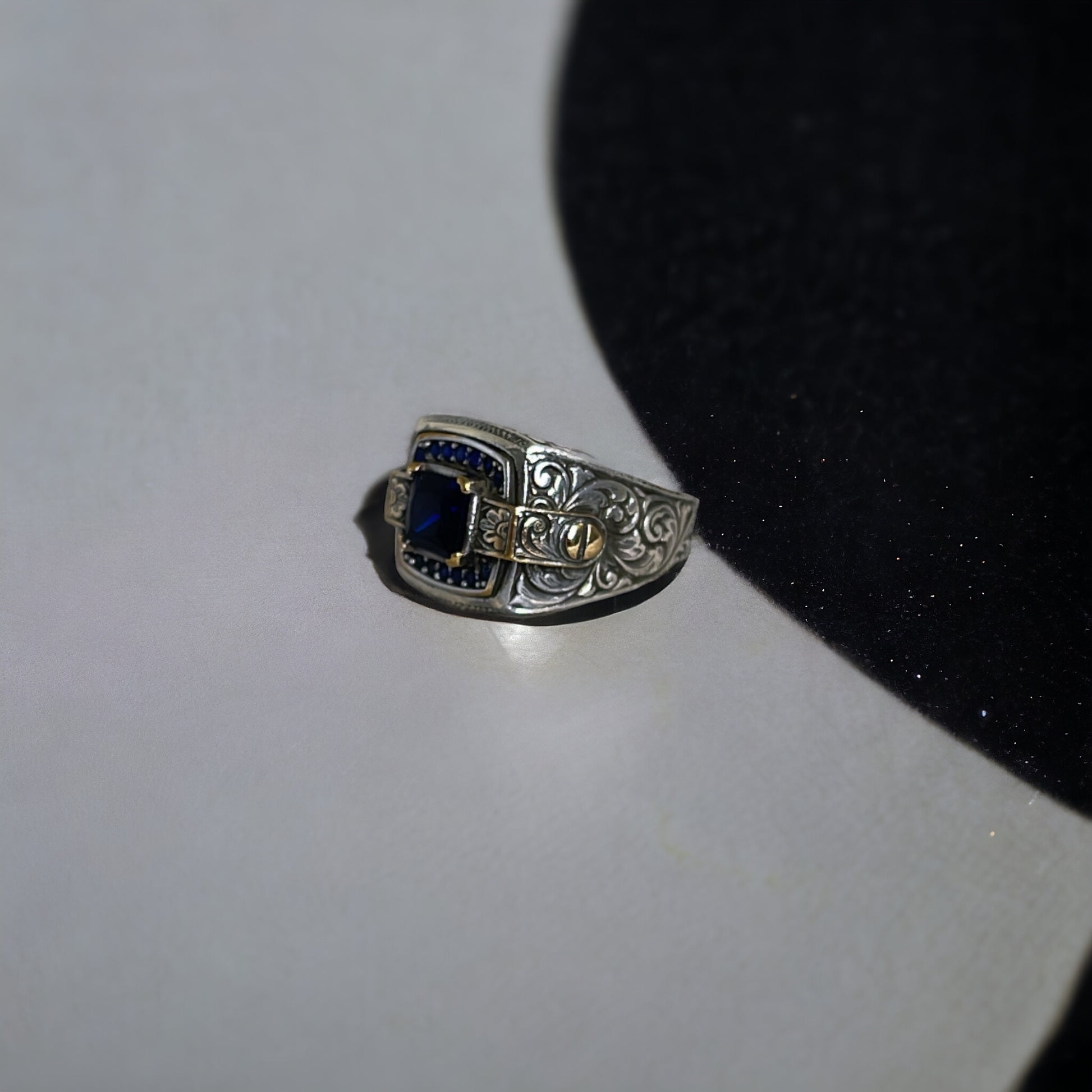 This ring features a deep blue sapphire zircon as its centrepiece, exuding timeless elegance and sophistication. The rich blue stone is framed by intricate silver detailing, showcasing an ornate band adorned with classic patterns that evoke a sense of tradition and refinement. The meticulous craftsmanship is further enhanced by subtle gold coloured accents, creating a striking contrast that makes this ring a standout piece in any collection.